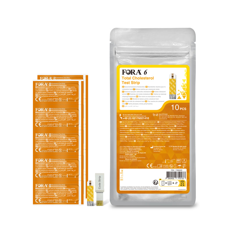 Mit den FORA 6 Gesamtcholesterin-Teststreifen kann in Verbindung mit einem Messgerät der FORA® 6-Reihe der Gesamtcholesterinspiegel von Patienten selbständig im eigenen Heim oder durch medizinisches Fachpersonal gemessen werden. Es werden frische Vollblutproben aus der Fingerbeere sowie von folgenden alternativen Entnahmestellen verwendet: Handballen, Oberarm und Unterarm. Dieses System ist nicht zur Diagnose von Diabetes mellitus oder für Tests auf Diabetes mellitus geeignet.